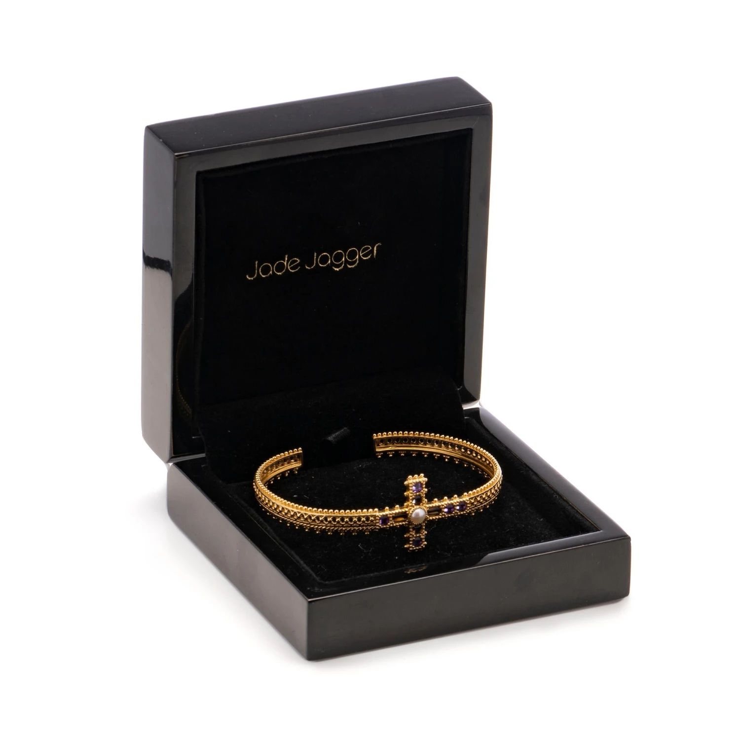 Jade Jagger started developing jewellery designs under her own name in the late 1990s. Her jewellery was recognised for its flamboyant, eclectic aesthetic, which used precious stones, gold, and silver. Her travels and interest in Eastern mysticism profoundly affected her designs, resulting in unusual and exotic items.