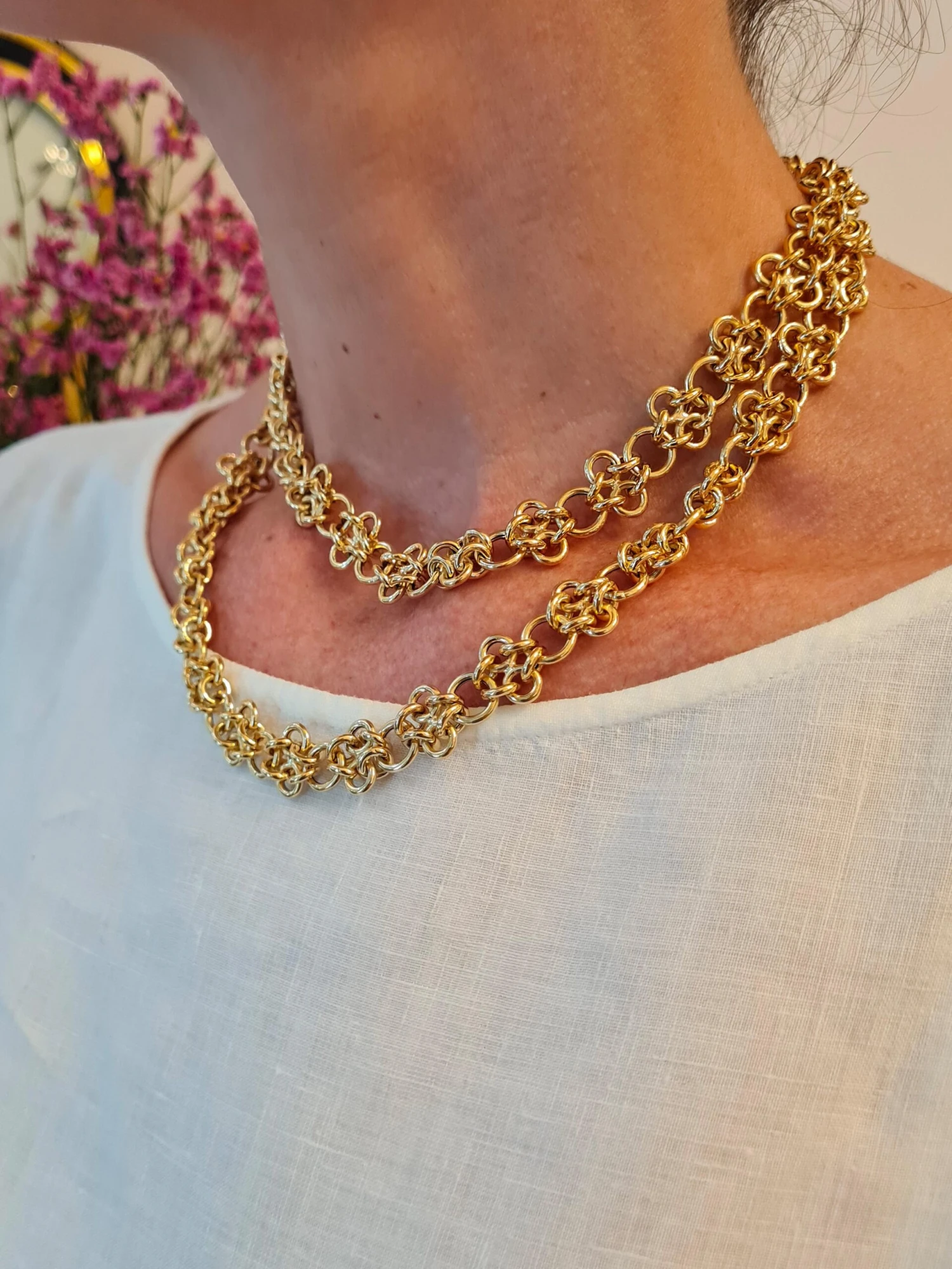 This necklace is 84 cm long and can be worn either long or double twisted.