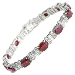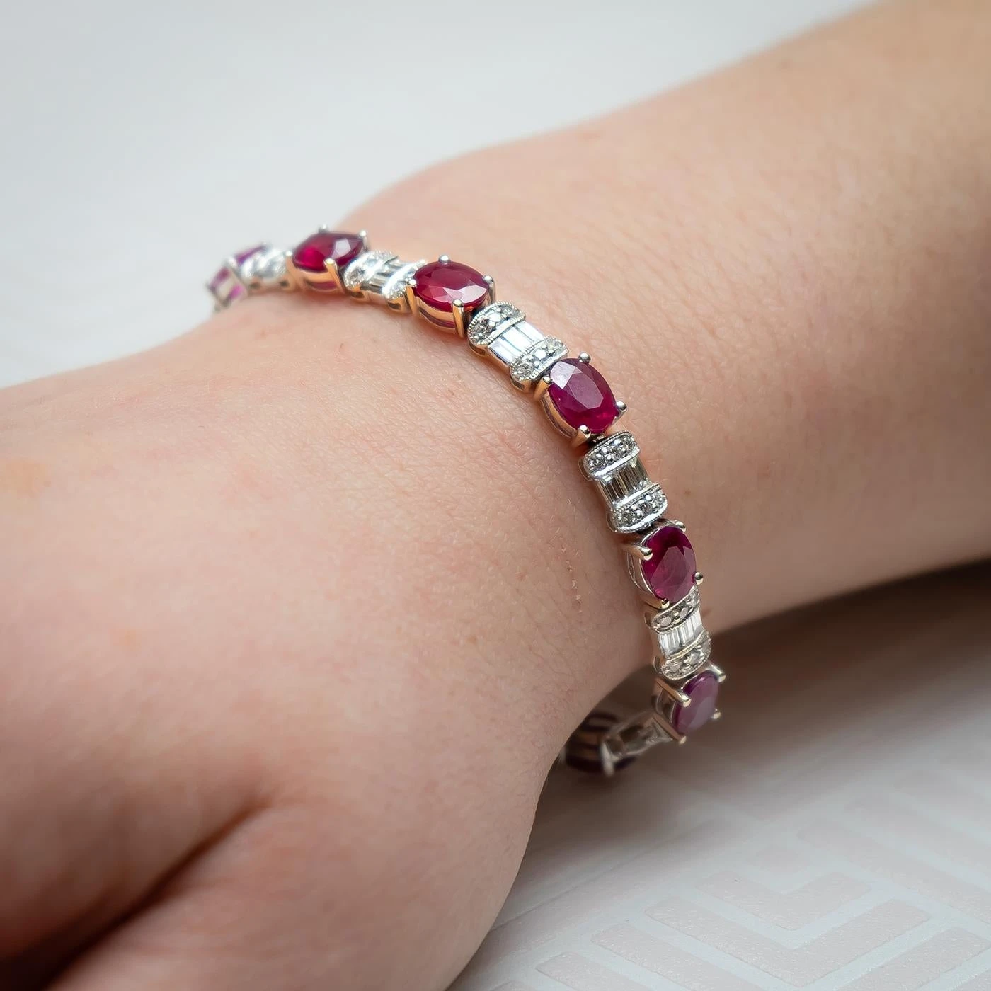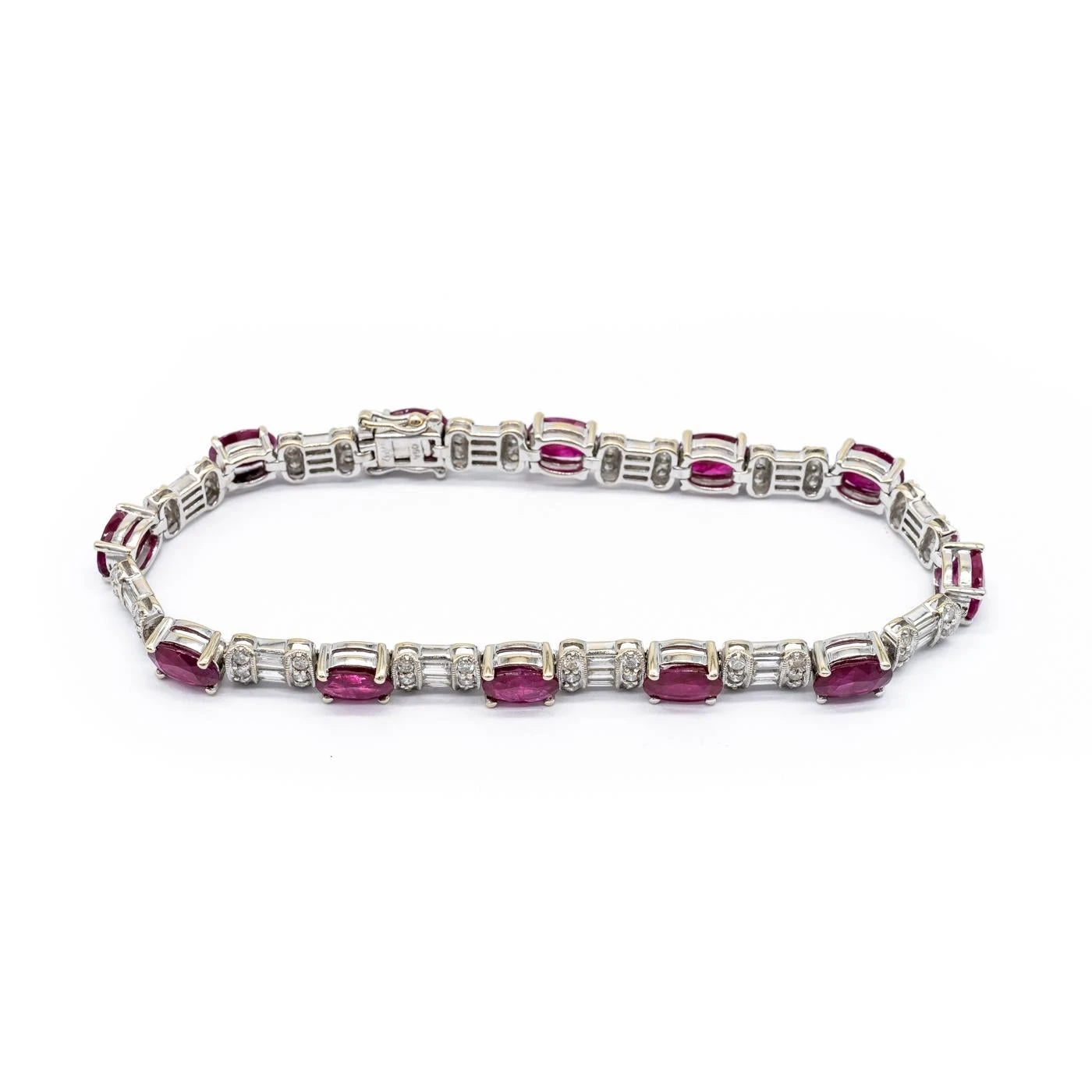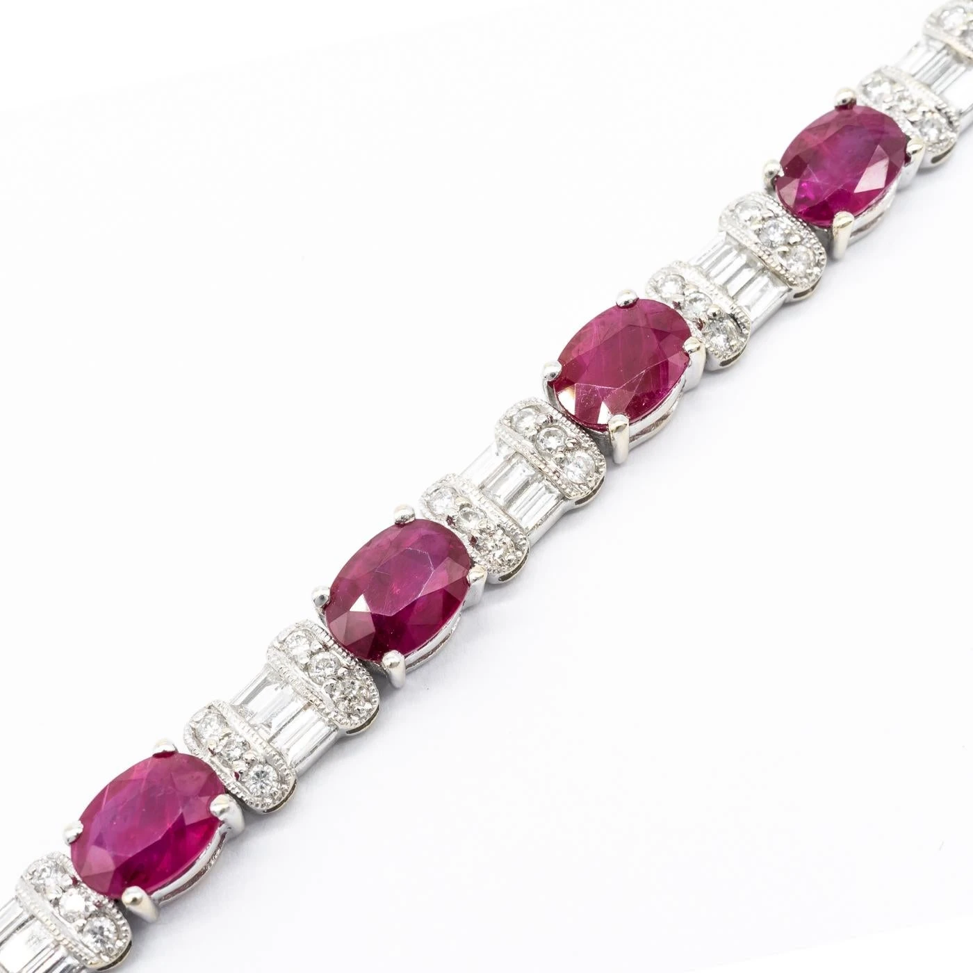 A modern ruby and diamond bracelet, set with oval faceted rubies weighing an estimated total of 2.30 carats, alternating with diamond sections each set with three baguette-cut diamonds, with three round brilliant-cut diamonds set each side, weighing an estimated total of 3.20 carats, mounted in 18ct white gold.