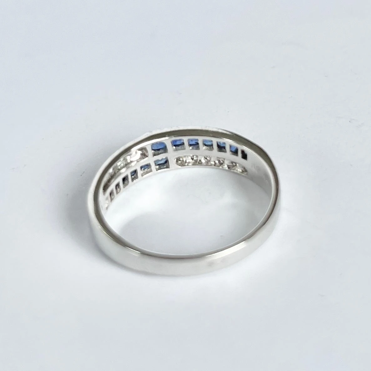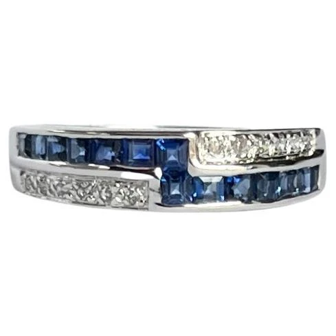 This 18carat gold crossover ring holds a row of sapphires and a row of diamonds. The rows of round cut diamond total approx 12pts and the square cut sapphires total approx 39pts.