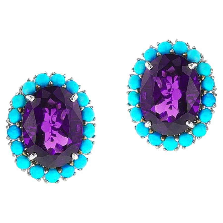 A pair of Oval Amethyst Cut and Turquoise Cabochon Earrings made in 18k White Gold. The total weight of the stones is 19.90 carats. The total weight of the earrings is 14.84 grams. The length of the earrings is 0.85″