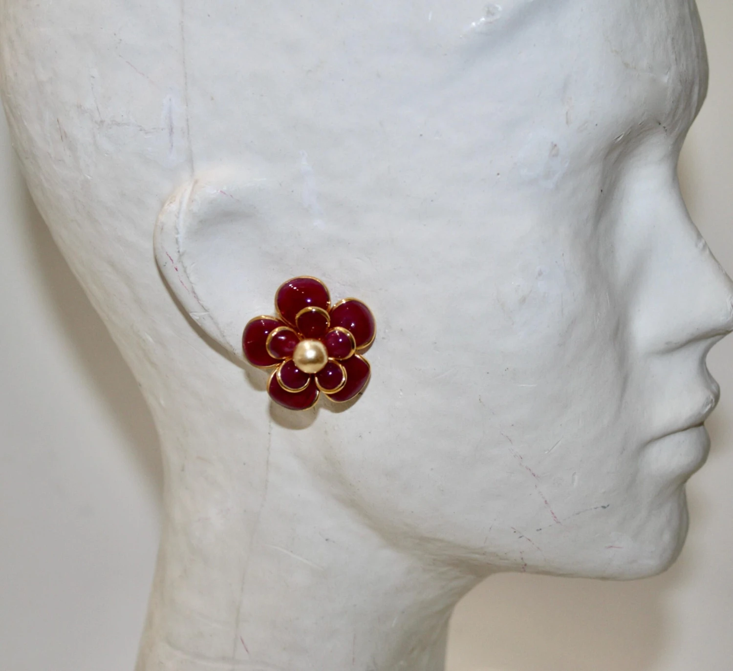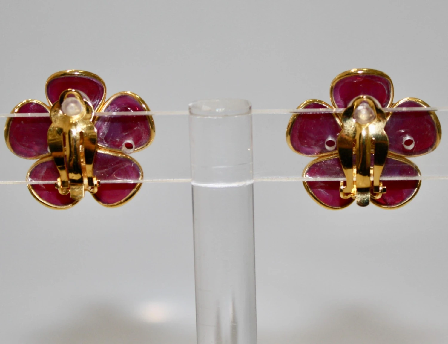 Designed by the former artisans of the atelier of Gripoix, made in the special process of pate de verre or poured glass. 18-carat gilded brass. Clip earrings.