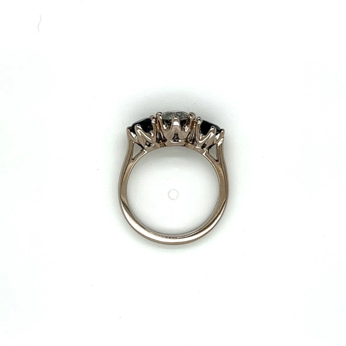 The diamond at the centre of the ring weighs 0.85 carats and is of J colour and I1 clarity. This colour and clarity provides the diamond with a depth and character that matches the deep, vivid blue of the sapphires on either side of it.