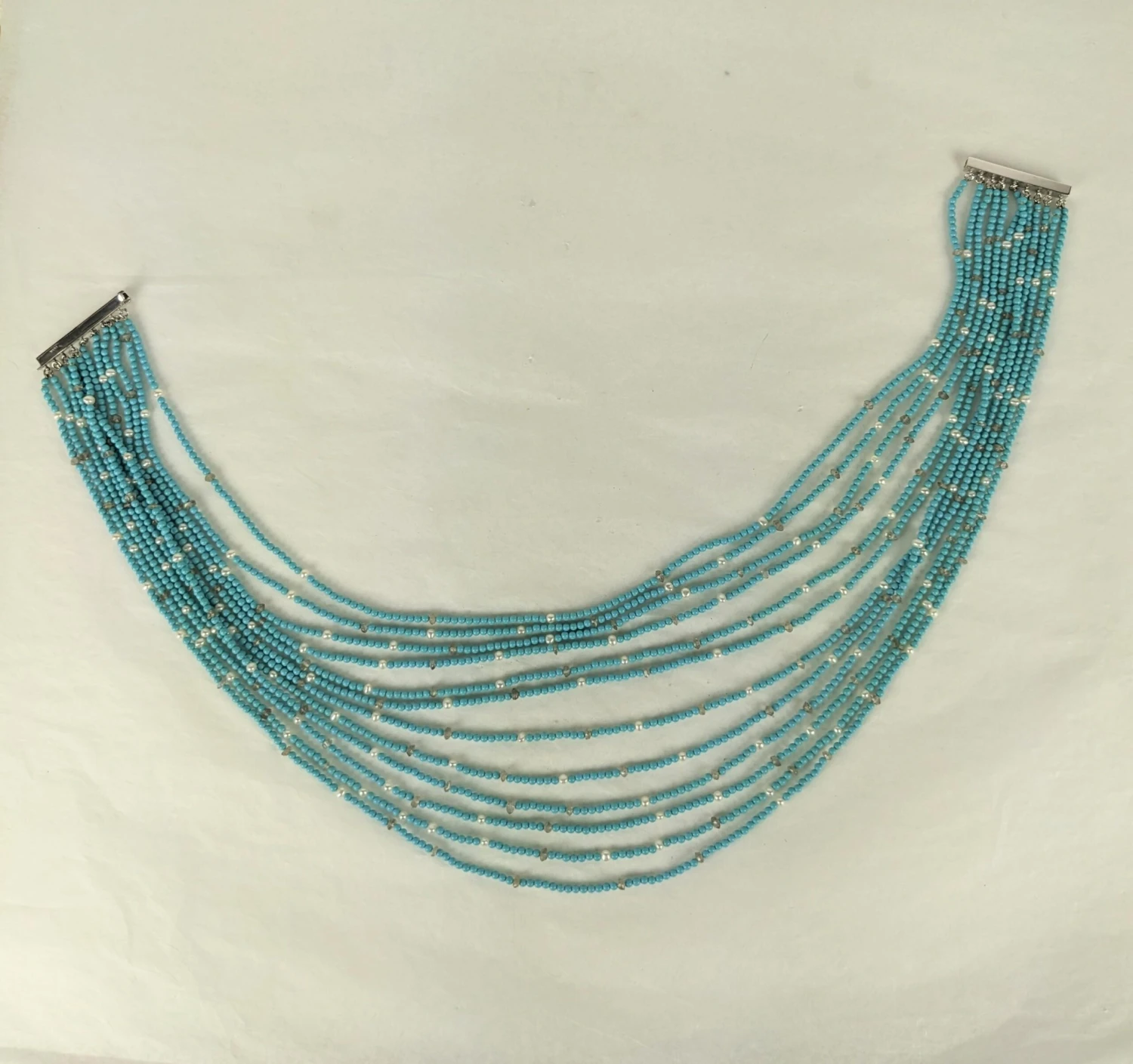 Graduated Seed Turquoise, Raw Diamond and Pearl Necklace with an 18k white gold clasp. Multiple strands of seed turquoise spaced with raw diamond beads and pearls. Shortest 15.5″. Longest 20″.