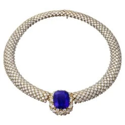 Versatile in design, this necklace is able to disassemble to form not just one, but four separate jewelry pieces. A glamorous 40.00-carat tanzanite bursts with color at the necklace’s center. Accented by 62.00 total carats of dazzling diamonds, the gem exhibits the deep violet color for which these stones are known and treasured. Exquisitely designed and set, this necklace makes an eye-catching statement. The necklace was conceived to be both beautiful and multi-functional; not only does it feature a detachable pendant that becomes a ring, but the chain itself detaches to form two independent bracelets. Set in 18K yellow gold.