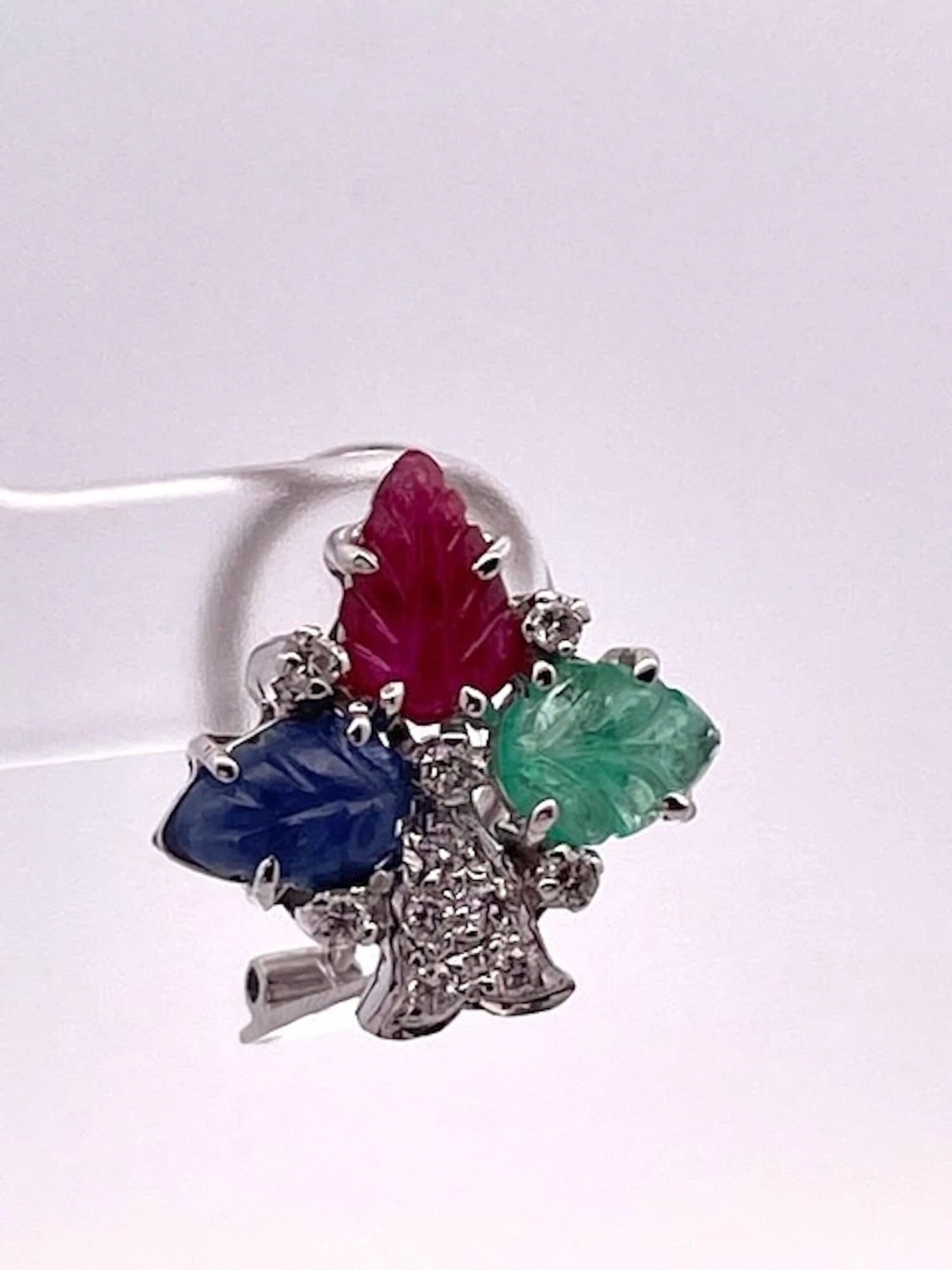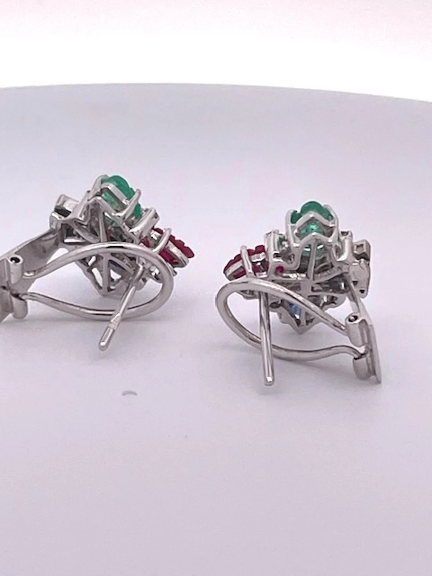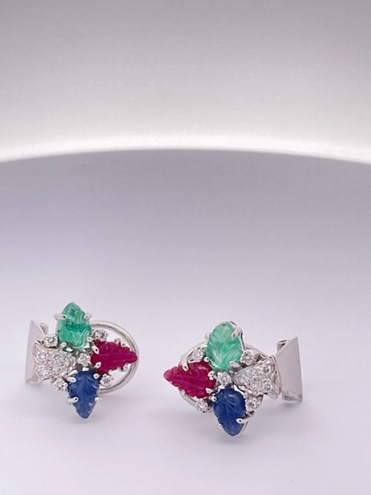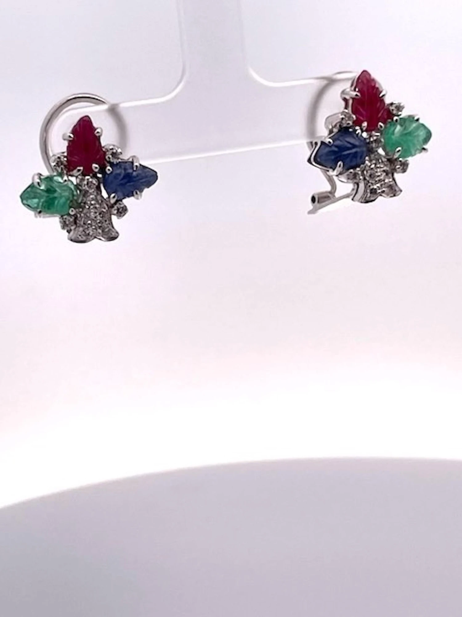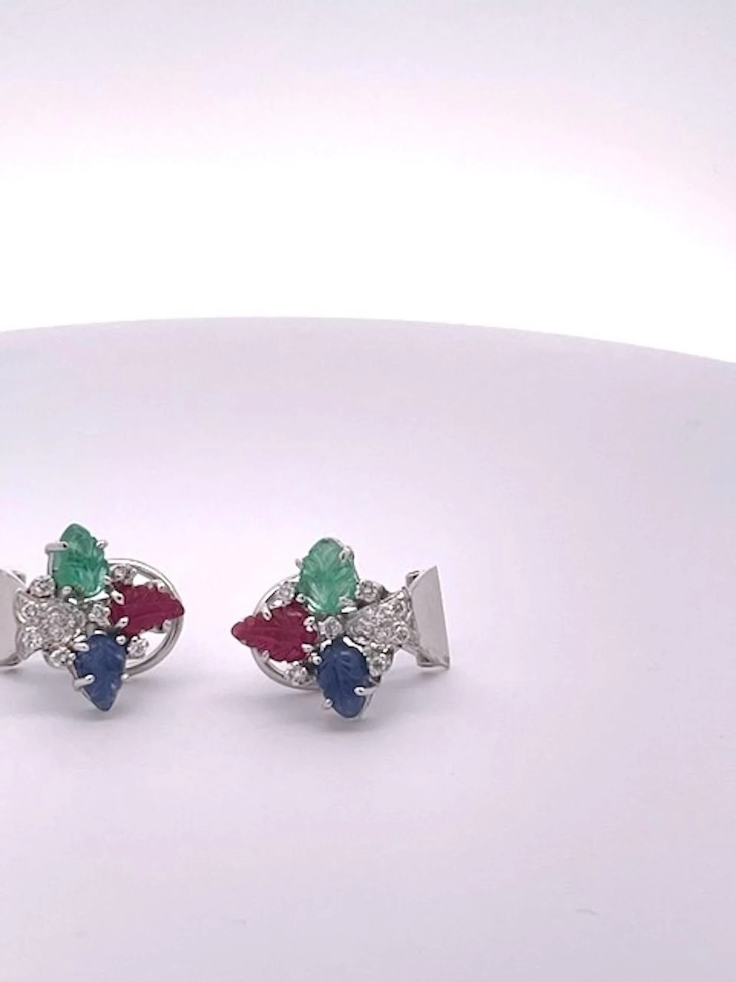 These Tutti Frutti in Earrings 18K White Gold are a beautiful match to both Tutti Frutti Bracelets that have listed. They are simple but when you have a large Tutti Frutti Bracelet you do not want to over power the bracelet with hugh earrings it is just too much. These simple earrings have 3 carved leaves one Emerald, one Sapphire, and one Ruby with Diamonds. The Diamonds form a bell shape and they are gorgeous stones, true Emerald green, true Sapphire Blue and a beautiful true red ruby. They weight 9.3 grams and measure 1.5cm x 1.5cm. These are lovely and I would not wait as these are priced to sell.