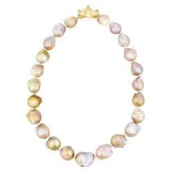 Multi-colored Yangtze River pearls drape gracefully around the neck in this classic necklace. These iridescent, Baroque pearls are called « fireball pearls » for their captivating fire and play of color, presenting a refreshing twist on the classic pearl necklace. The pearls measure between 15mm and 19mm and display the natural metallic hues for which they are so coveted. A delightful 18K yellow gold clasp in the shape of a seashell completes the strand.
