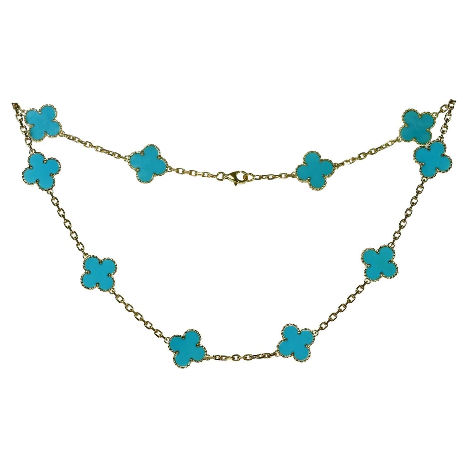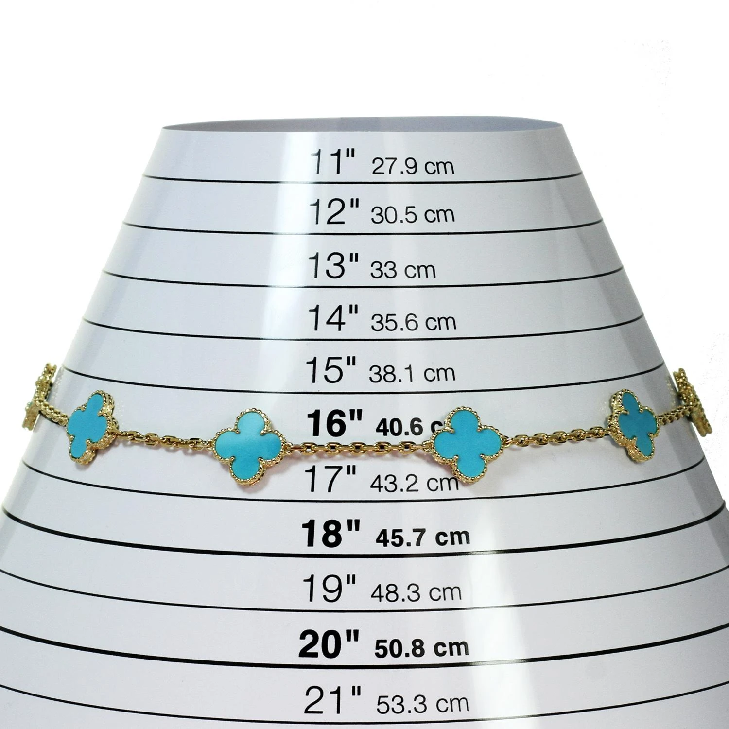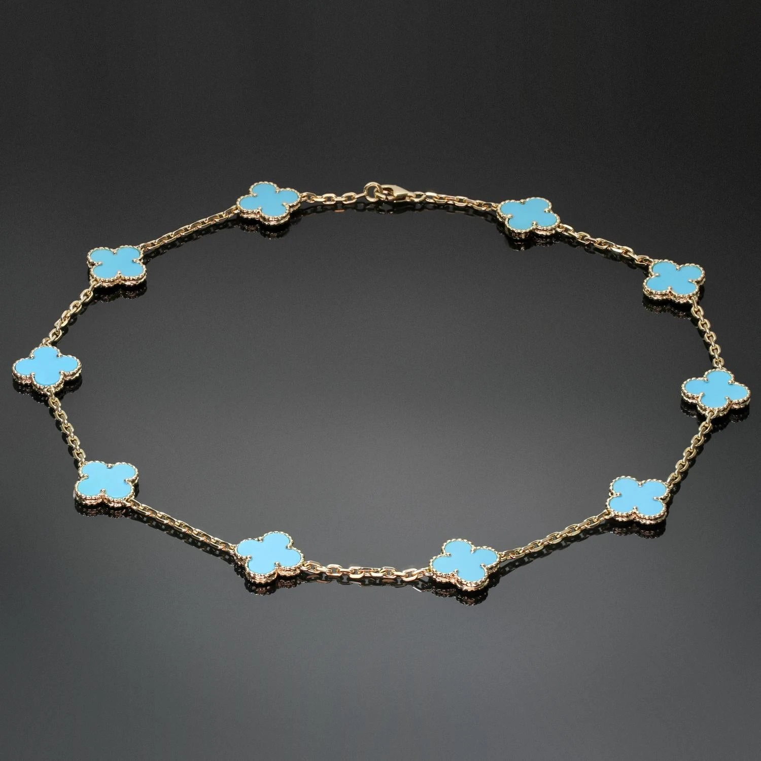 This classic authentic Van Cleef & Arpels necklace is crafted in 18k yellow gold and features 10 lucky clover motifs inlaid with blue turquoise in round bead settings. Made in France circa 2010s. Measurements: 0.59″ (15mm) width, 16.75″ (42.5cm) length. Excellent condition. Comes with original pouch and VCA service receipt.