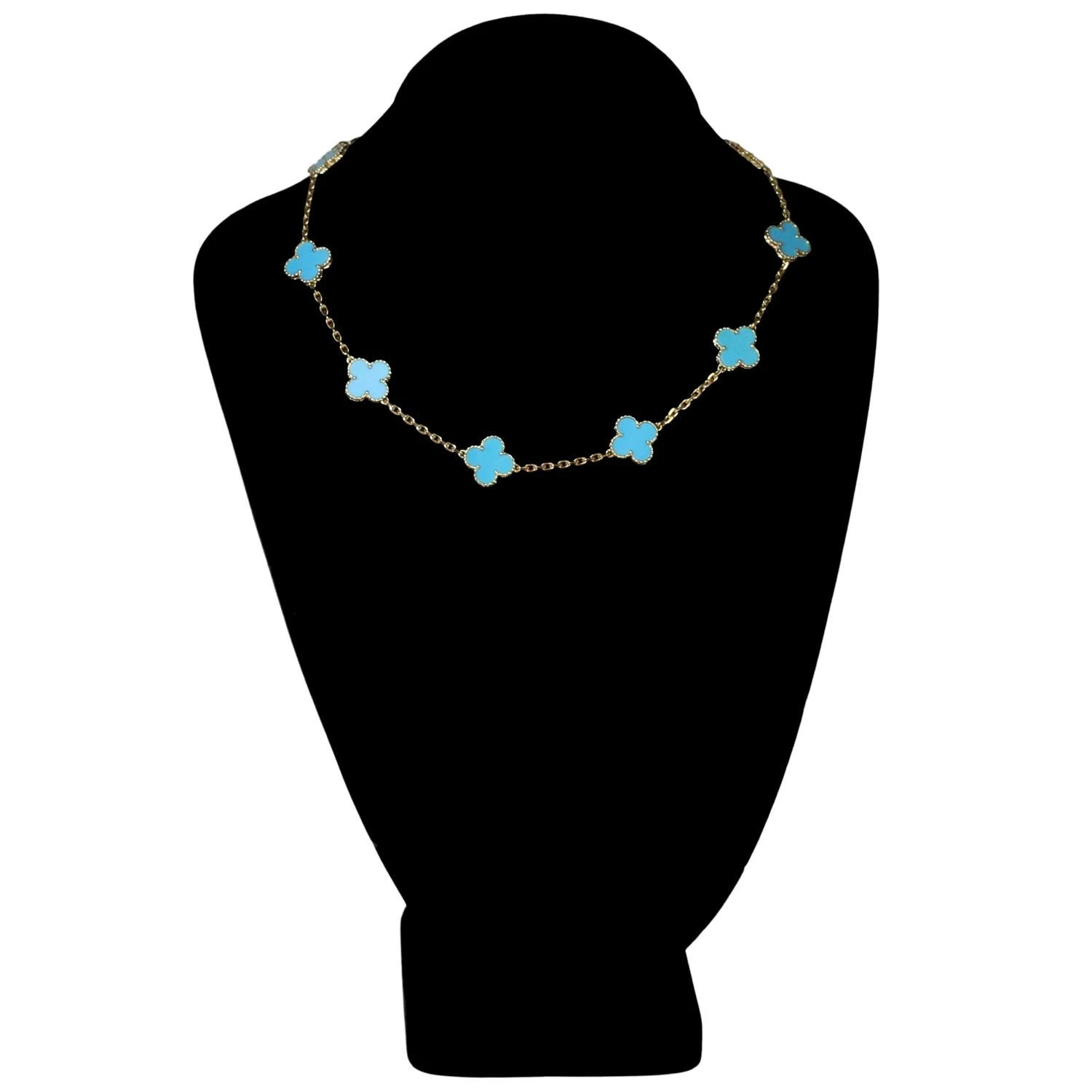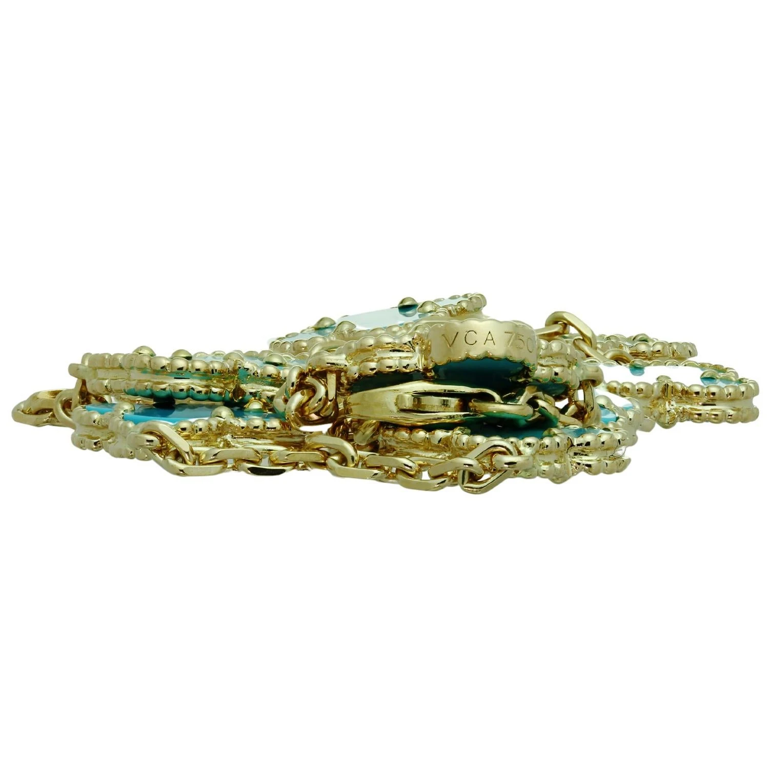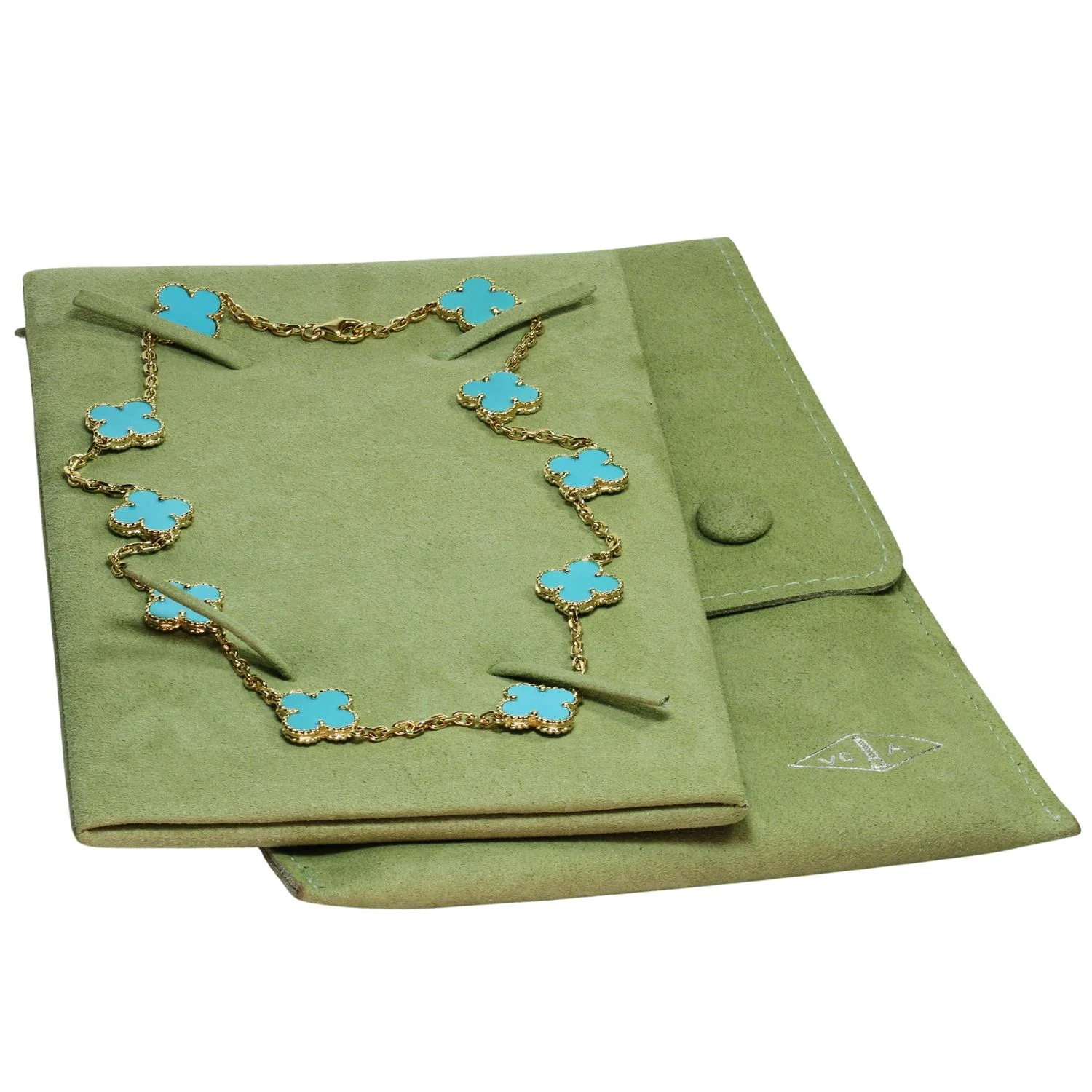 This classic authentic Van Cleef & Arpels necklace is crafted in 18k yellow gold and features 10 lucky clover motifs inlaid with blue turquoise in round bead settings. Made in France circa 2010s. Measurements: 0.59″ (15mm) width, 16.75″ (42.5cm) length. Excellent condition. Comes with original pouch and VCA service receipt.