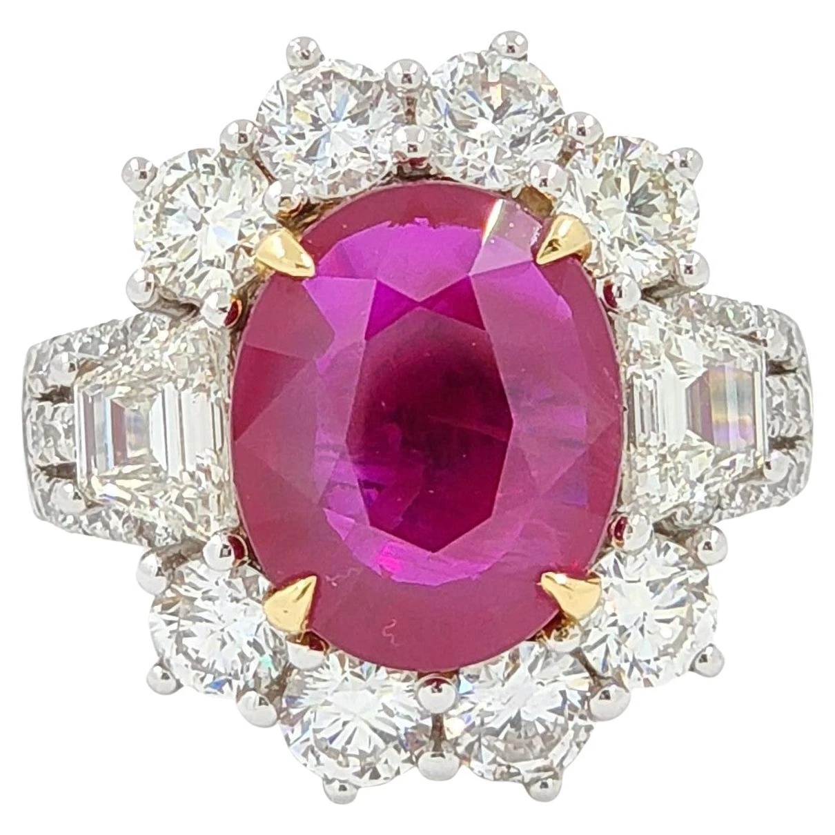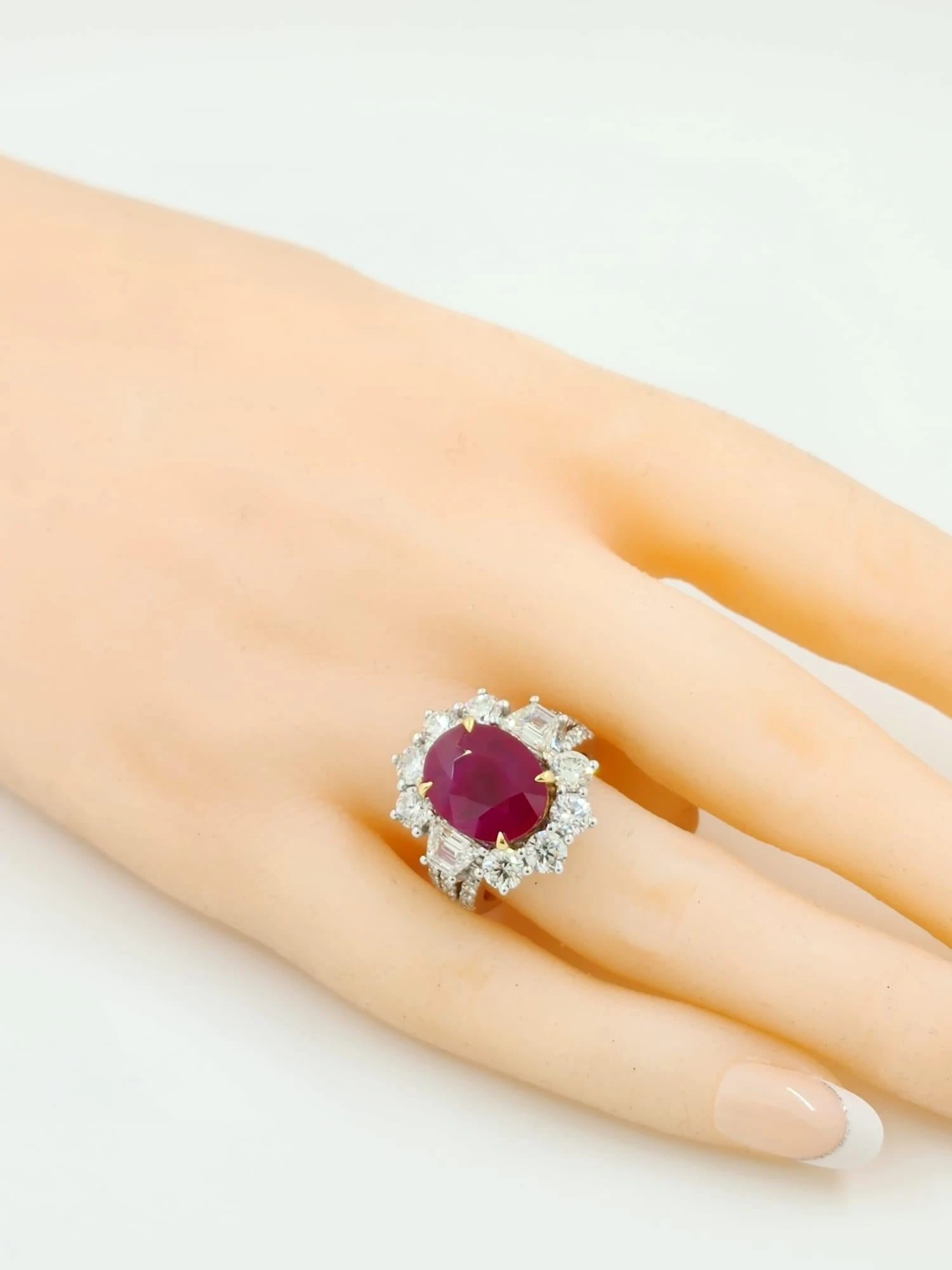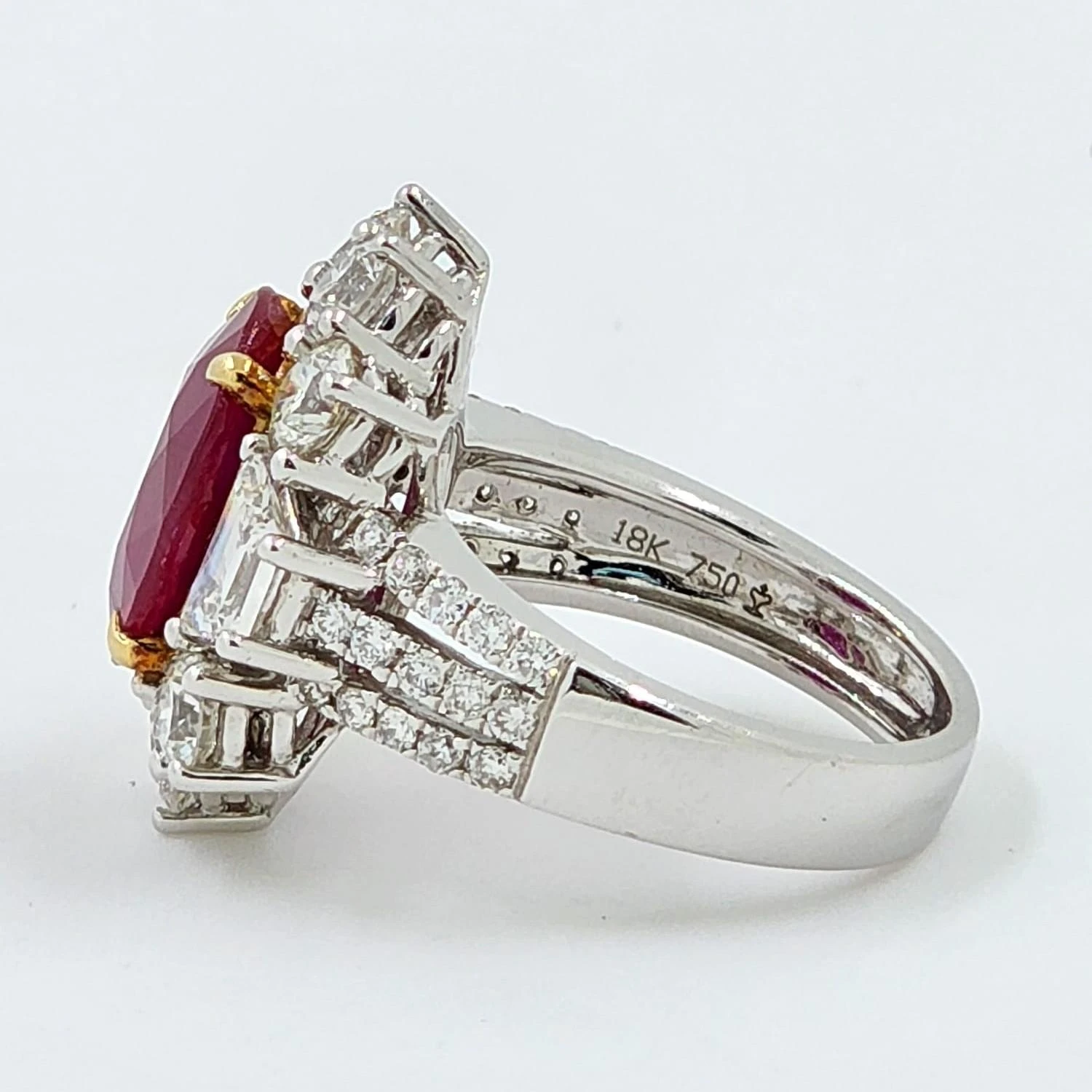 Experience the allure of our 5.04ct Burmese Ruby and Diamond Ring. Set in 18k white gold, this contemporary masterpiece showcases a ruby with a GRS Swiss Lab report. The deep red hue of the 5.04ct Burmese Ruby is beautifully complemented by 3.13ct of sparkling diamonds. Meticulously crafted, this ring exudes elegance and sophistication, making it the perfect gift that lasts a lifetime. Embrace the rarity and beauty of this exquisite ring, a symbol of eternal love and refined luxury.