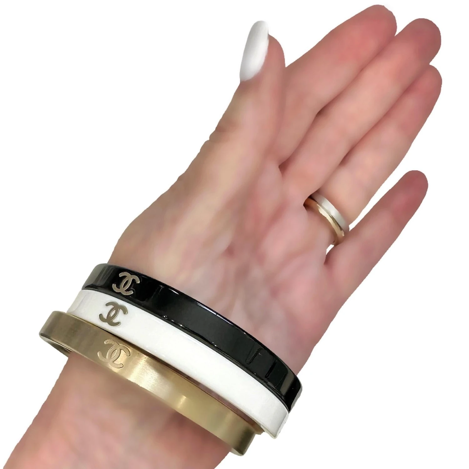 This wonderful, vintage Chanel set was released as part of the Autumn 2010 collection. Fabricated from Gold Tone brushed metal and resin. Each of the three bracelets is embossed with the CHANEL double C logo in three places. Inside each piece is a cartouch bearing the name CHANEL, the Chanel logo, the coding for Autumn 2010 season (B10A) and MADE IN ITALY. The set when worn together measures 1 inch wide. The set is easy to wear . It is strong enough in style to stand alone by itself, or can be stacked with other bangles. The inside circumference measures 8 inches. Gross weight 63.1 grams.