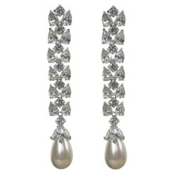 Vintage Costume Jewelry Diamanté Pearl Sterling Long Dangly Earrings Made With Diamond Quality Pear Shaped Cubic Zirconia and ManMade Pearls Stunning flexible 3.5 inches long for pierced ears.