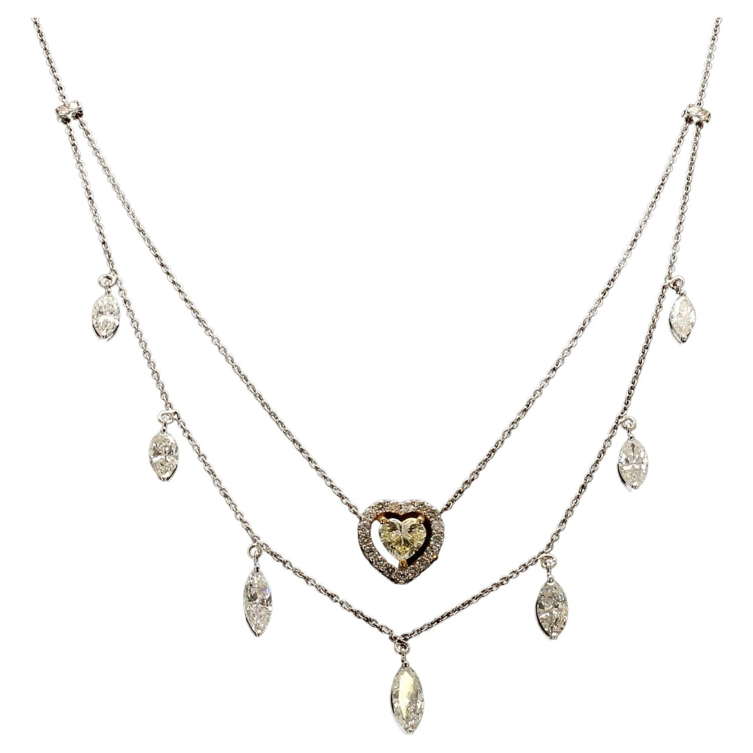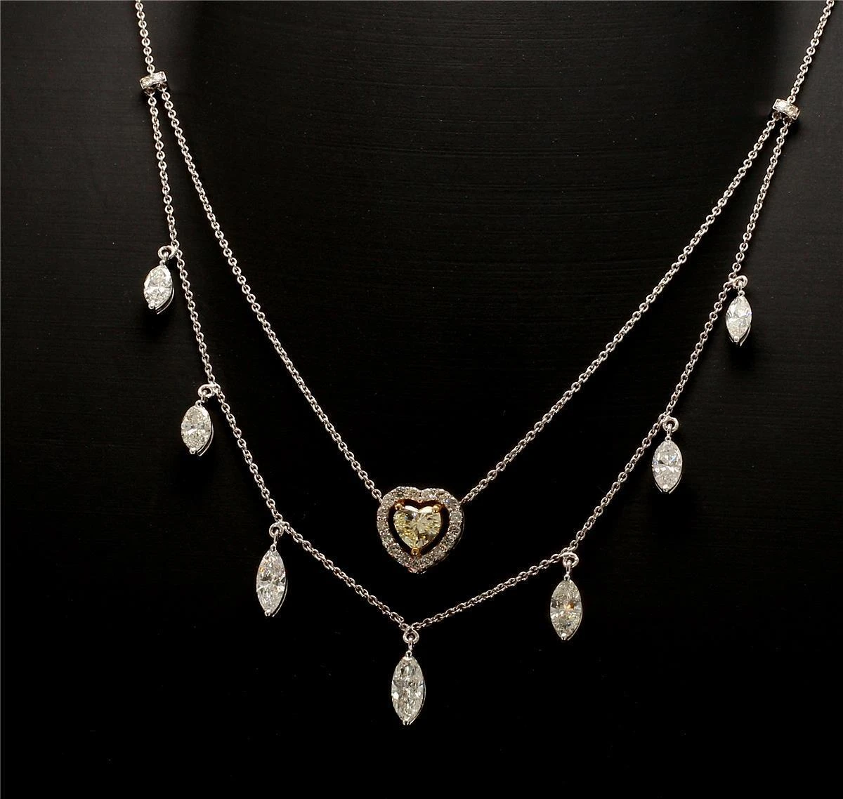 Introducing our stunning two-row necklace, designed to make a statement and turn heads. The necklace features a beautiful center yellow heart with a halo of sparkling white marquise diamonds in the first row, and a second row filled with exquisite white marquise diamonds that add an extra touch of luxury.